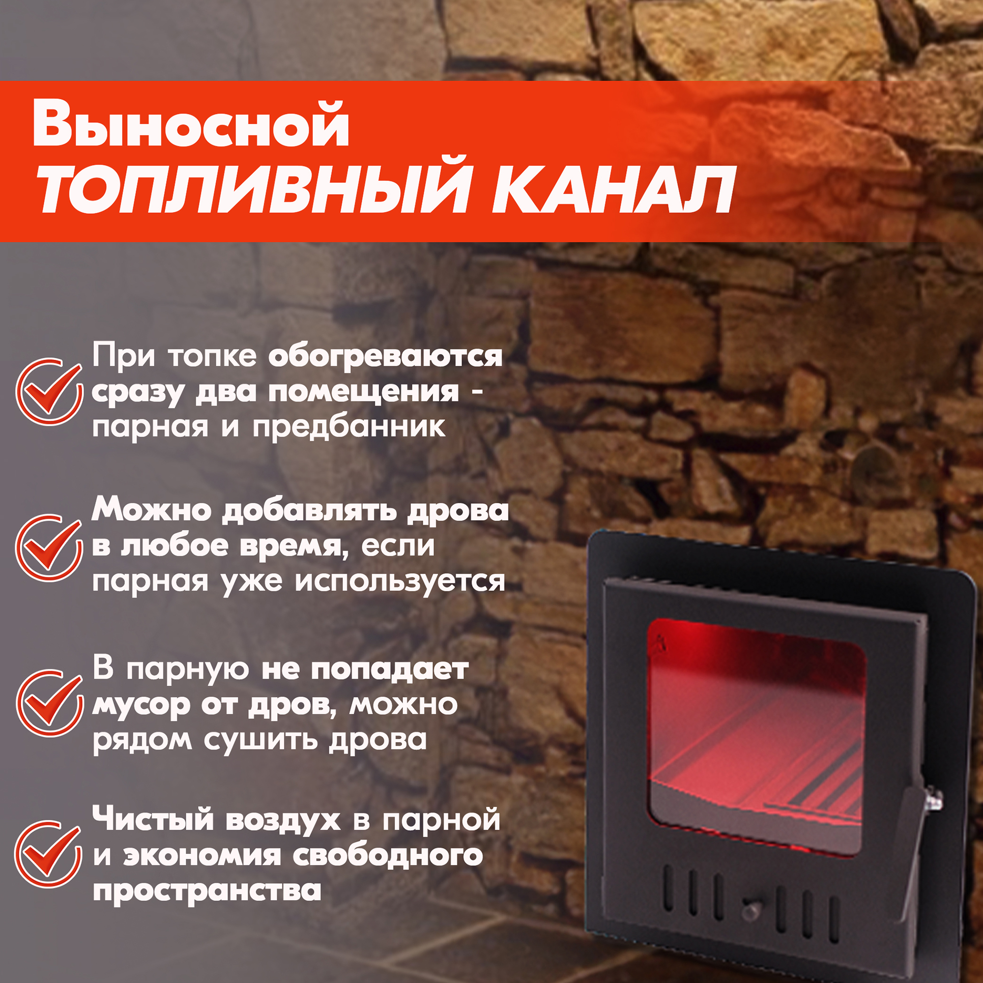 Эффективное расположение открытой каменки прямо над верхней частью топочной камеры позволяет быстро и эффективно нагревать камни, что обеспечивает нужную температуру и пар в парной.